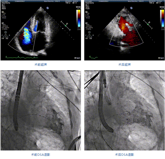 團(tuán)隊前期經(jīng)過多次討論,制定了周密的手術(shù)策略和預(yù)案。由于患者已是近九旬的超高齡老人,傳統(tǒng)外科開胸手術(shù)風(fēng)險極高,純介入經(jīng)血管三尖瓣替換能夠明顯減少創(chuàng)傷。術(shù)中陳茂及馮沅教授結(jié)合體表定位在造影指示下精準(zhǔn)穿刺右側(cè)頸靜脈并預(yù)置兩把血管縫合器。成功建立經(jīng)皮血管入路后在食道超聲和DSA的引導(dǎo)下順利完成人工瓣膜植入,術(shù)后超聲和造影顯示人工三尖瓣同軸性良好,瓣架固定牢靠,無反流和瓣周漏,平均跨瓣壓差降為1mmHg。術(shù)畢收緊預(yù)置的血管縫合器縫線完成止血,縫合效果滿意,在手術(shù)室即刻拔除氣管插管。