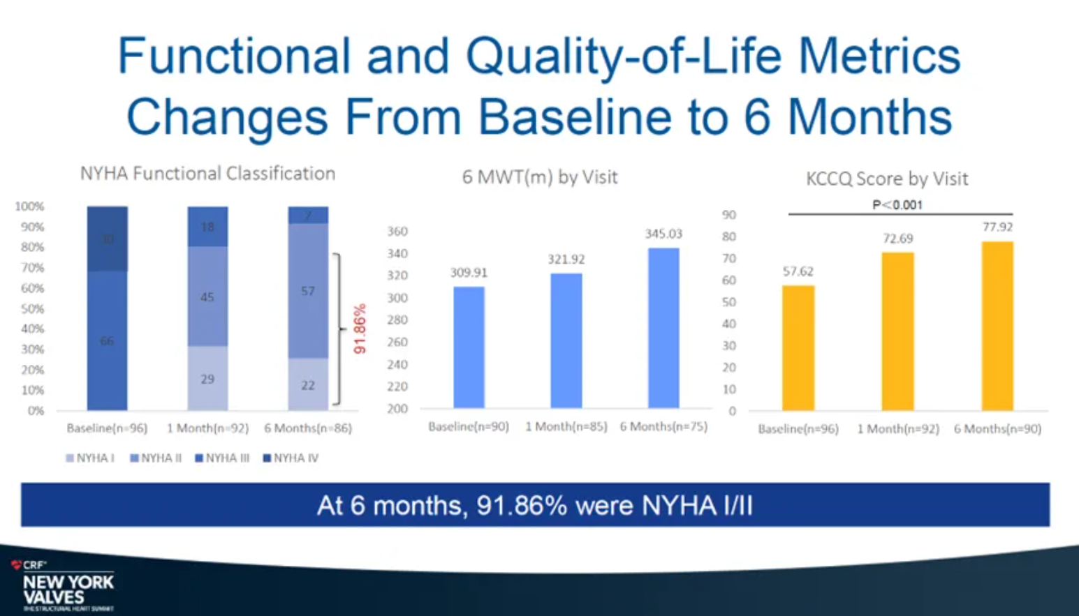 有效性結果顯示,患者的反流等級、心功能等級,以及生活質量顯著改善。100%的患者在30天顯示無中度及以上反流,97.62%的患者在6個月時顯示無中度及以上反流。同時,根據(jù)超聲數(shù)據(jù)顯示,患者右心系統(tǒng)重構也獲得受益。