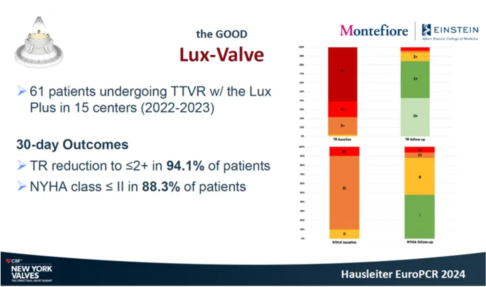 早在今年5月舉辦的2024歐洲介入心臟病學大會(EuroPCR 2024)上,來自德國慕尼黑路德維希·馬克西米利安大學醫(yī)院(Klinikum der Ludwig-Maximilians-Universität München, Munich, Germany)的Jörg Hausleiter教授公布了在全球多中心開展的同情救治使用經(jīng)驗。在2024年紐約瓣膜會上,Hausleiter教授再次提及LuX-Valve Plus,并介紹到對于無法采用TEER術式的患者也是適用的,例如瓣口接合有較大缺陷和超大瓣環(huán)的患者,以及超聲影像質量較低不適合夾子術式等情況。此外,LuX-Valve Plus能夠擴大治療方式的選擇,尤其是對于超大解剖結構的患者來說,并且展示了優(yōu)異的早期結果。目前,以獲得CE認證為目標的臨床試驗正在歐洲持續(xù)展開。